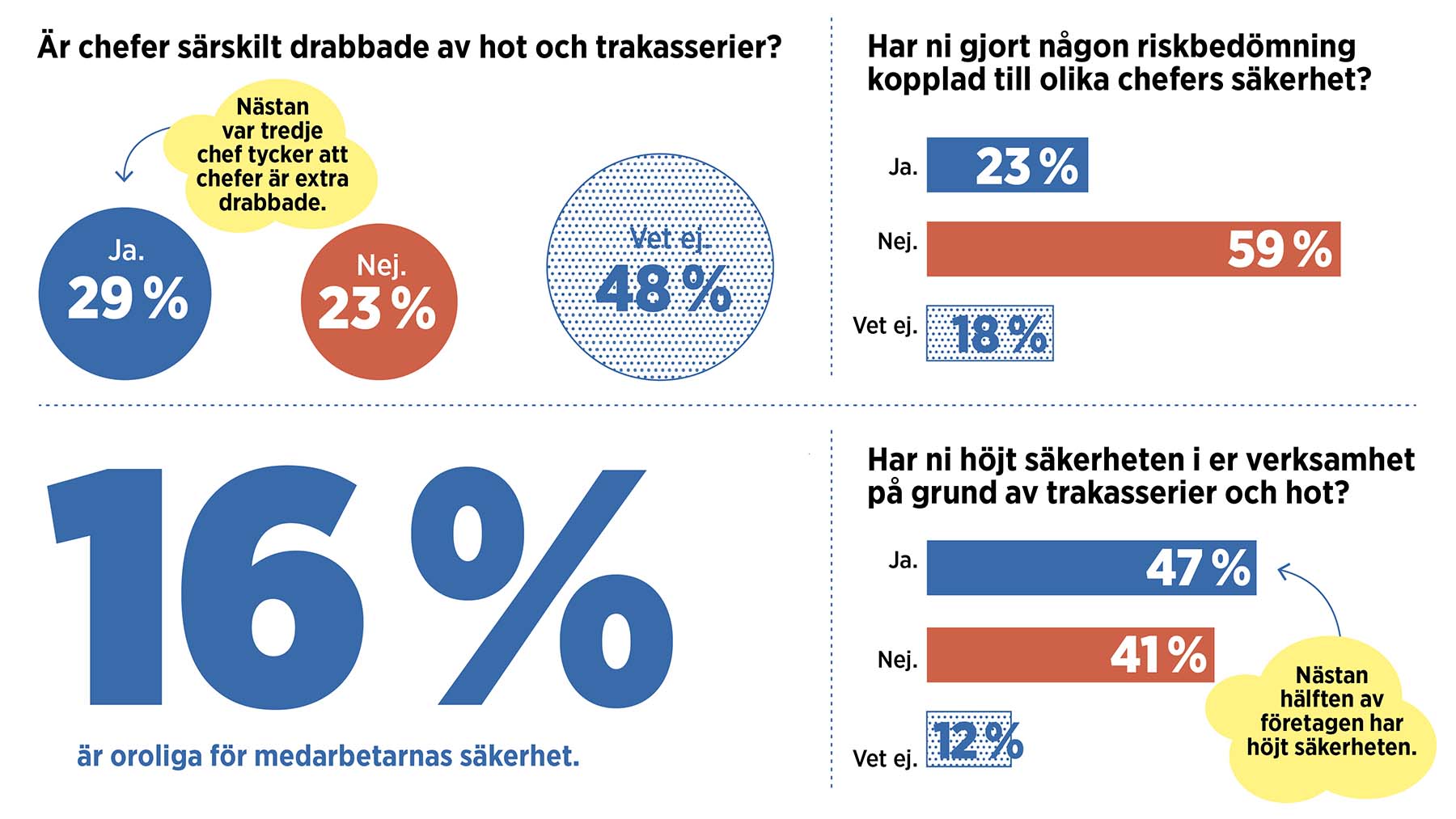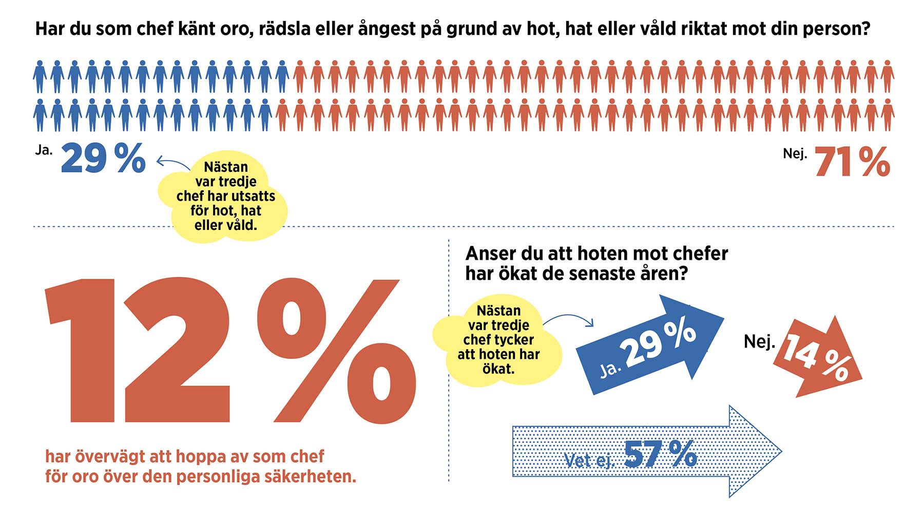 I Chefs undersökning anser 29 procent att chefer är speciellt drabbade av hot och trakasserier, medan 23 procent säger att de inte är det. En knapp tredjedel av cheferna anser att hoten mot chefer har ökat de senaste åren.