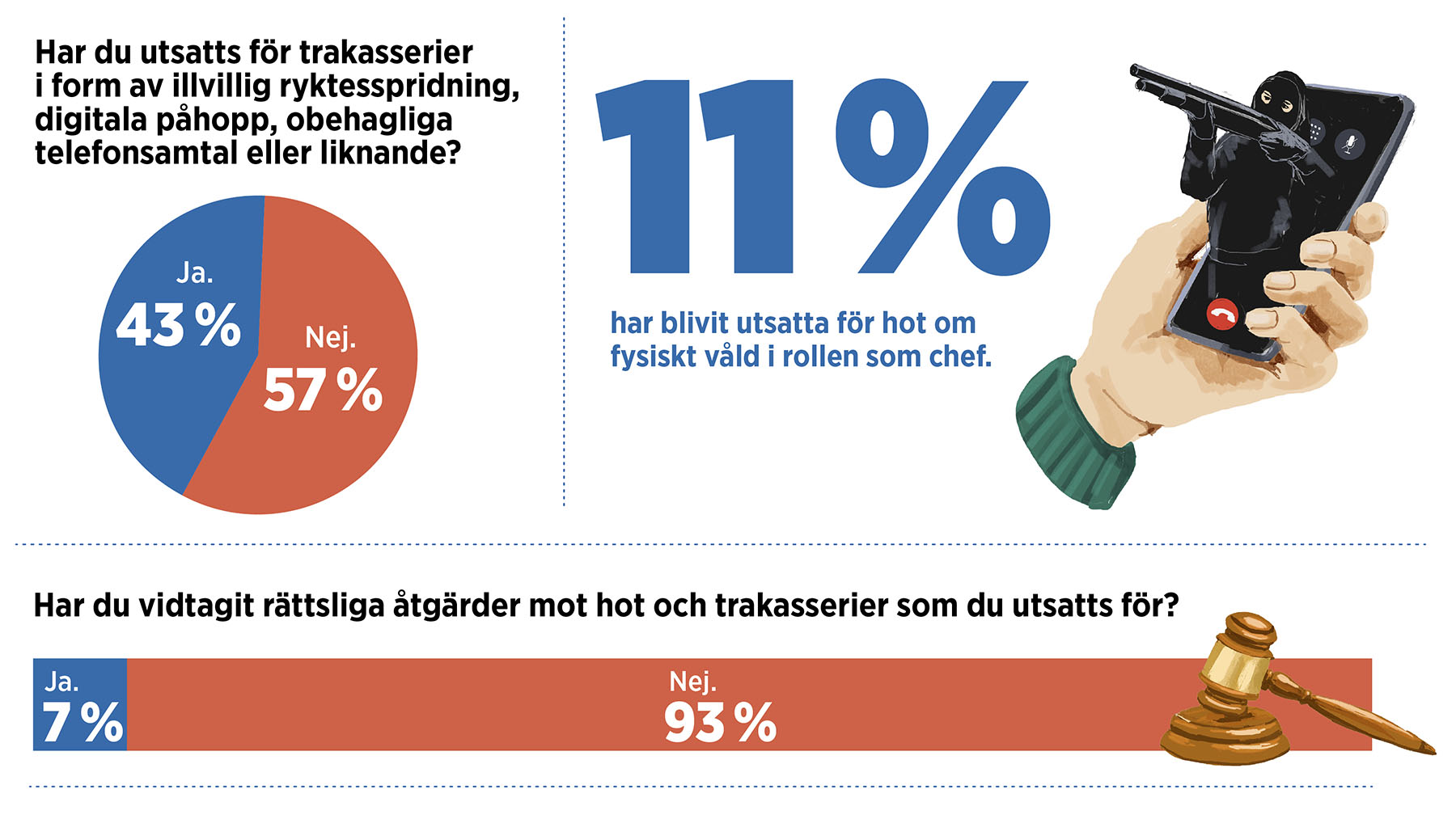 Det tycks också, av undersökningen att döma, ha skett en förflyttning mot främst verbala trakasserier. Från en fjärdedel 2018 till att nästan hälften av cheferna i dag (25 till 45 procent) är utsatta för trakasserier i form av illvillig ryktesspridning, digitala påhopp, obehagliga telefonsamtal eller liknande.