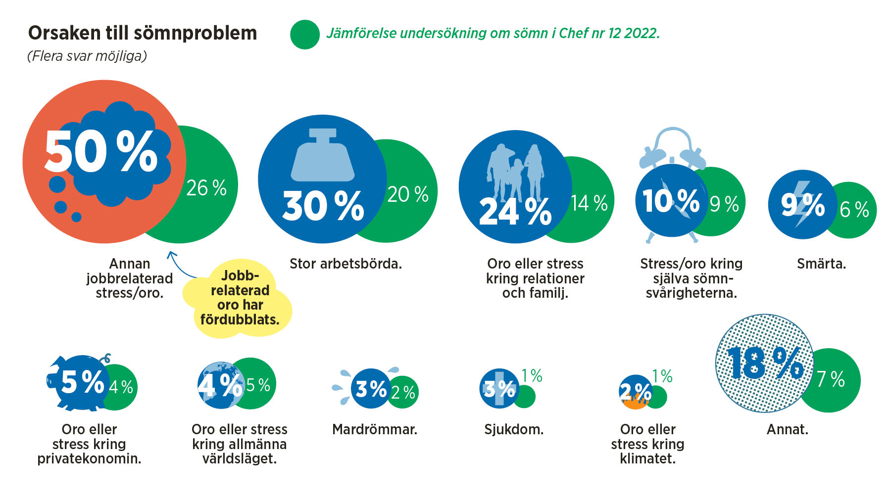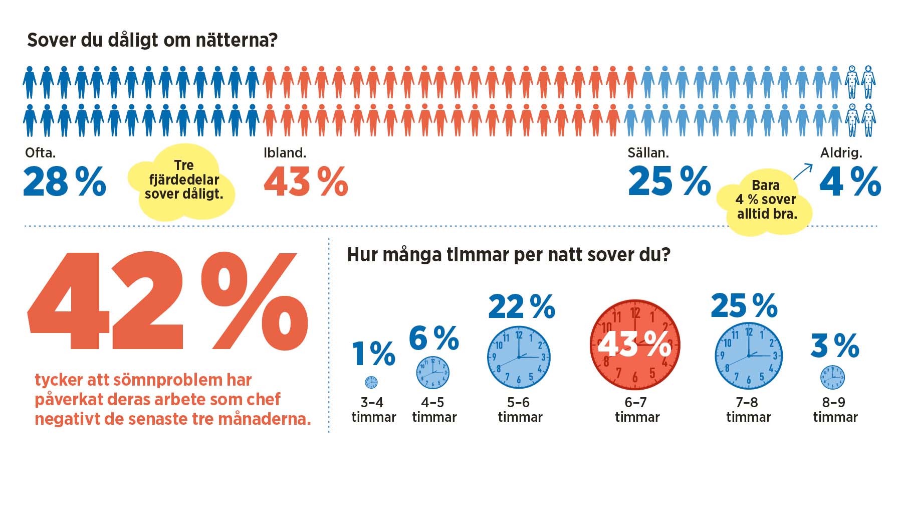 Enligt Folkhälsoinstitutets uppgifter från 2024 sover nära hälften av svenskarna dåligt, och enligt Chefs färska undersökning gäller det för 71 procent av cheferna (med reservation för en överrepresentation av kvinnliga chefer, då kvinnor har mer sömnbesvär än män sett till populationen).