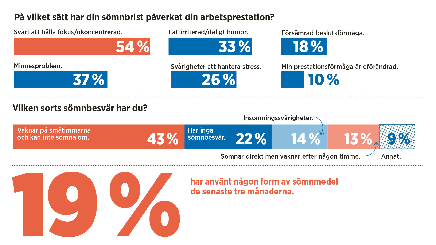 De har också svårigheter att hantera stress och upplever att de har försämrad beslutsförmåga. Endast tio procent av de som uppger att de har sömnproblem säger att deras prestationsförmåga är oförändrad.