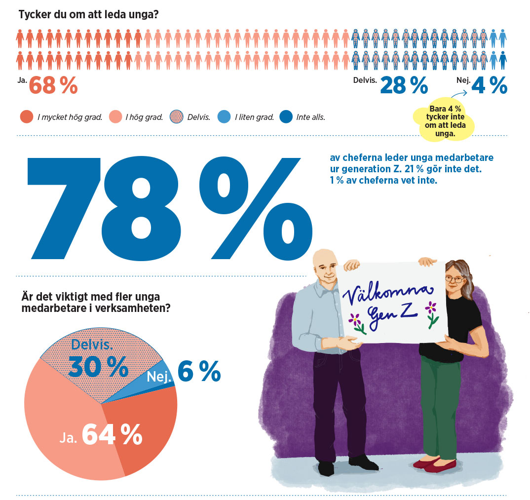 Närmare 80 procent har också vana av att leda unga och en klar majoritet ser det som viktigt att få in fler unga i verksamheten. Närmare hälften ser ett stort behov av anpassning gentemot den unga generationen. Undersökningen pekar också på att de flesta chefer har enbart delvisa svårigheter med att leda generation Z.