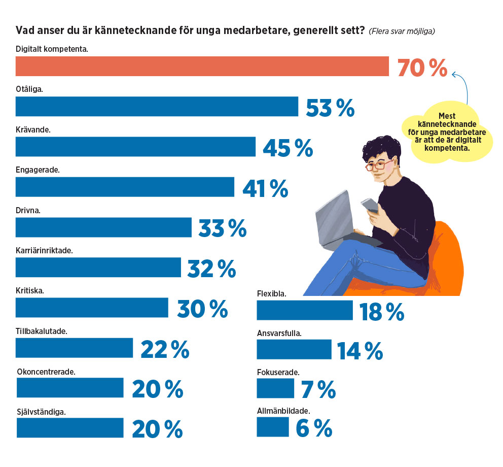 Chefs undersökning bekräftar samtidigt bilden av generation Z som driven, otålig och skyhögt digitalt kompetent. Bristvaror är däremot allmänbildning, koncentration och ansvarsförmåga, enligt cheferna (se grafik nedan).