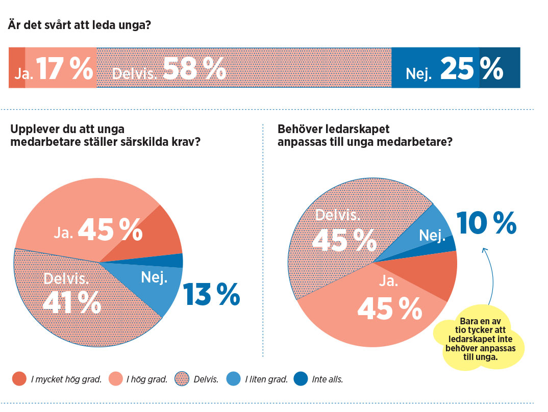 Först ska dock framhållas att cheferna i det stora hela säger sig tycka om att leda unga. Så många som en fjärdedel till och med i mycket hög grad.