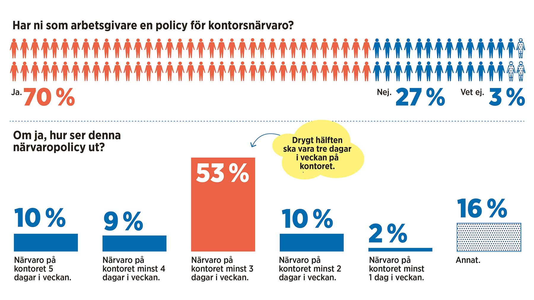 Chefs undersökning visar att majoriteten av arbetsgivare, drygt 70 procent, har en policy för kontorsnärvaro och att den i drygt hälften av fallen består av närvaroplikt minst tre dagar i veckan. Drygt 10 procent har en närvaroplikt på fem dagar i veckan.