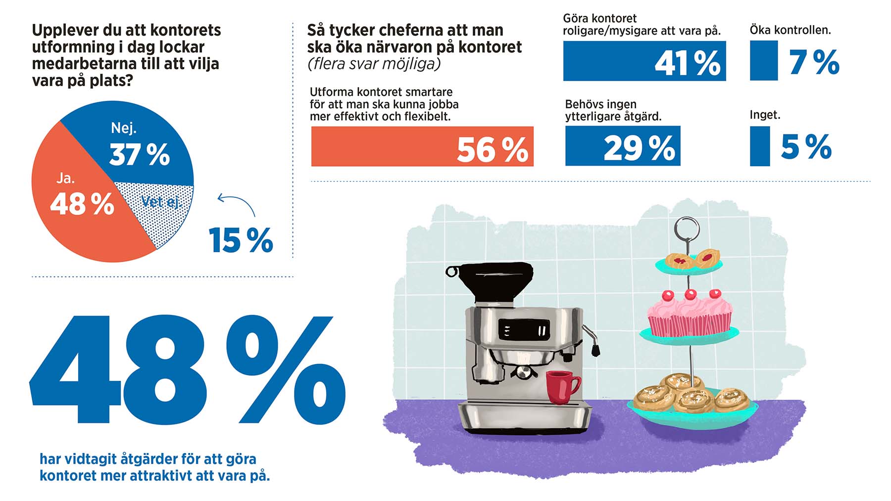 ”Utforma kontoret smartare för att kunna jobba mer effektivt och flexibelt”, menar dryga 56 procent av cheferna i undersökningen. Drygt 40 procent anser att man skulle behöva göra kontoret roligare och mysigare att vara på. Endast 6 procent förespråkar ökad kontroll.