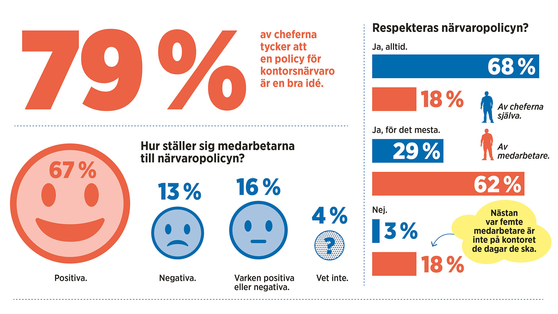 I Chefs undersökning uppskattar drygt 18 procent av cheferna att deras medarbetare alltid respekterar närvaropolicyn, 62 procent menar att medarbetarna för det mesta gör det. Och drygt 18 procent tycker att det är svårt att få medarbetarna att vara på kontoret alla dagar de ska.